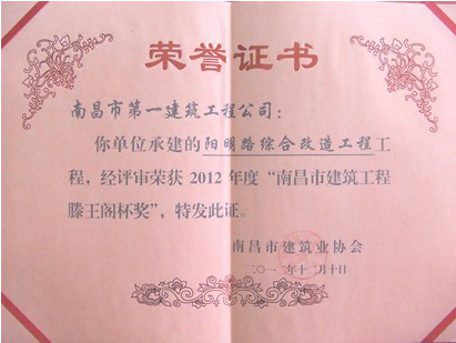 在激烈的市場競爭中,我公司本著負責任的態(tài)度,嚴把工程質量關,在“陽明路綜合改造工程”建設中榮獲2012年度南昌市建筑業(yè)協(xié)會頒發(fā)的“南昌市建筑工程滕王閣杯獎”,同時,梅文華同志獲得“優(yōu)秀項目管理工作者”光榮稱號,為公司贏得了榮譽。