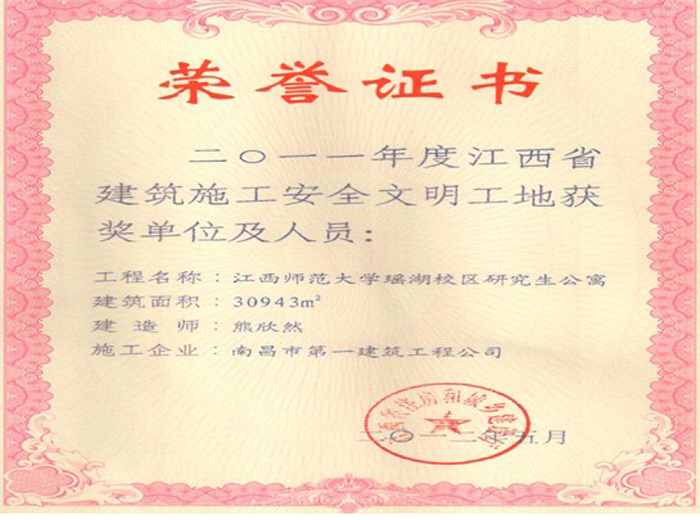 我司江西師范大學瑤湖校區(qū)研究生公寓項目工程獲得本年度“江西省建筑施工安全文明工地”稱號,該工程經(jīng)省級建筑安監(jiān)部門嚴格考核,通過層層篩選,在為數(shù)不多的省級樣板工地中脫穎而出,工程現(xiàn)場的安全文明設施布置規(guī)范、整潔,獲得專家評審組的一致好評。