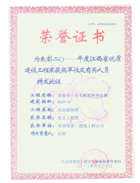 我司承建的“宜春市一八七研究所辦公樓”工程喜獲年度省優(yōu)良工程獎。該工程經(jīng)過省優(yōu)良工程獎初審、現(xiàn)場復(fù)查、評審委員會評審,并在江西建設(shè)監(jiān)督網(wǎng)進行了為期一個月的公示,于2013年1月30日江西省建設(shè)工程安全質(zhì)量監(jiān)督管理局向我司頒發(fā)了省優(yōu)良工程獎榮譽證書,本工程項目經(jīng)理由雷群擔(dān)任,監(jiān)理單位為江西省贛宜工程監(jiān)理咨詢有限公司。
