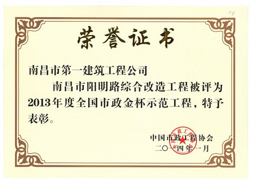 日前,由南昌市一建公司承建的陽(yáng)明路改造工程,榮獲全國(guó)市政工程最高獎(jiǎng)“全國(guó)市政金杯示范工程獎(jiǎng)”。