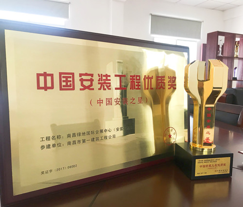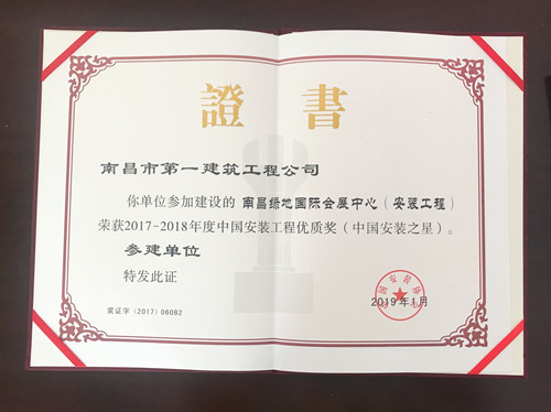 南昌市一建暖通分公司承建的江西綠地國(guó)際會(huì)展中心項(xiàng)目中央空調(diào)小園弧工程,被中國(guó)安裝協(xié)會(huì)評(píng)為第一批2017——2018度中國(guó)安裝工程優(yōu)質(zhì)獎(jiǎng),榮獲“中國(guó)安裝工程優(yōu)質(zhì)獎(jiǎng)(中國(guó)安裝之星)”殊榮,董事長(zhǎng)劉揚(yáng)國(guó)同志被授予企業(yè)領(lǐng)導(dǎo)人(參建)特別榮譽(yù)證書(shū)。